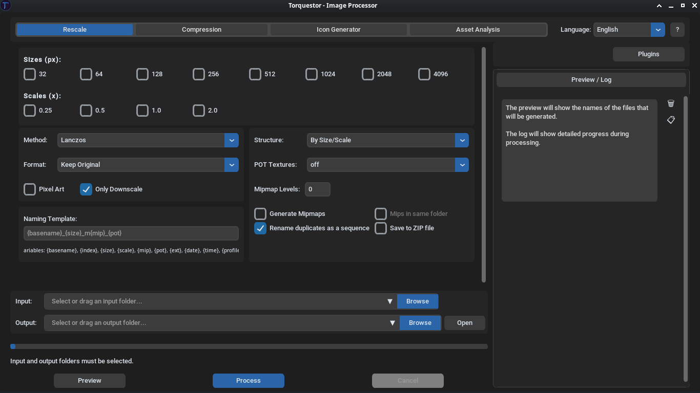 My name is Luis, and after making two games and wasting time rescaling assets and creating icons for Godot Engine exports, I became interested in creating Torquestor. Initially, Torquestor was going to be basic, with only rescaling and icon creation for Godot, because I planned to keep it for myself. But then I saw that this could be a pretty useful tool if I turned it into complete software designed to optimize and prepare assets, which made me decide to add more complete features like the asset compressor and asset analyzer, and to perfect the existing sections.